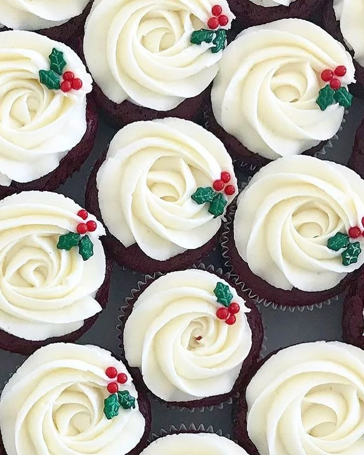 Soft vanilla and chocolate cupcakes topped with fluffy green and white frosting, finished with cute holly sprinkles. Simple, festive, and perfect for any holiday celebration! Includes six cupcakes.